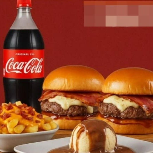 Nosso irresistível combo acompanha 2 Burgers Especiais a sua escolha, Batata com Cheddar e Bacon, Coca-Cola 1,5l e Sobremesa.