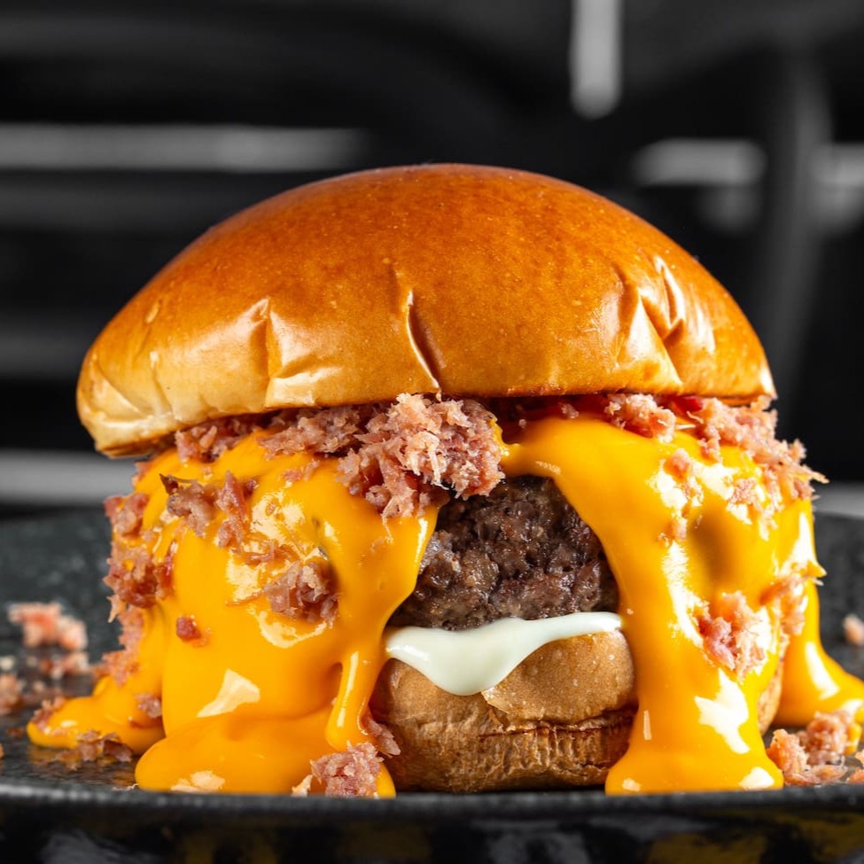 Delicioso Hambúrguer Artesanal feito com carne de 170g, Queijo Cheddar derretido em um Pão Brioche macio e uma irresistível farofa crocante de bacon. Prepare-se para uma experiência gourmet irresistível!