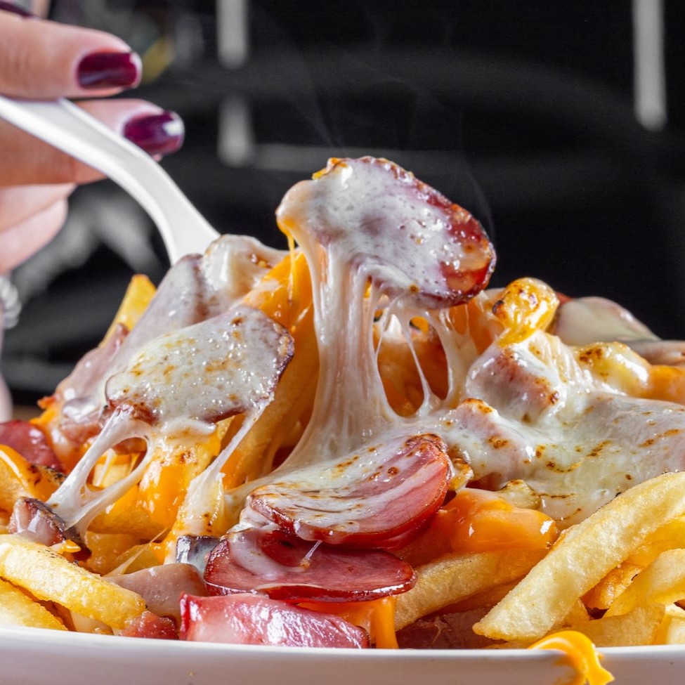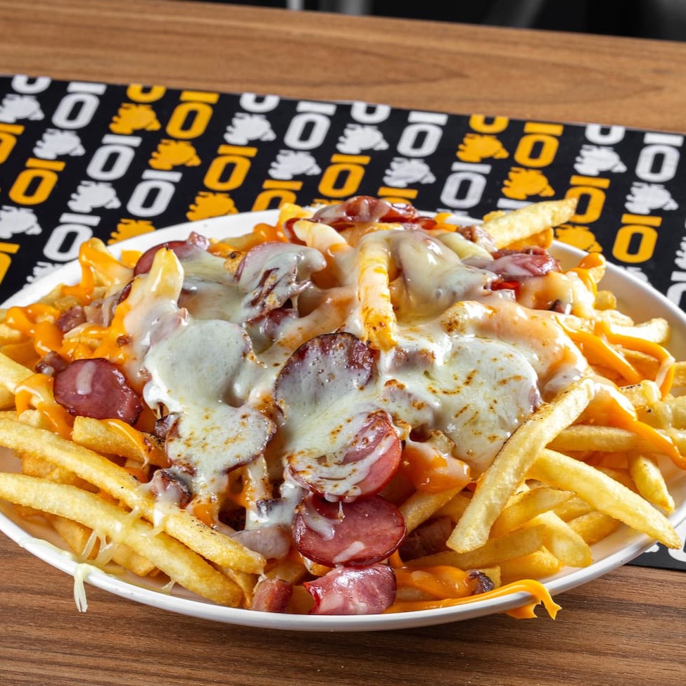Batata frita, cheddar , Bacon, calabresa e mussarela gratinada