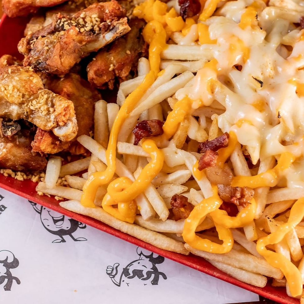 Frango a passarinho, batata, cheddar, Bacon e queijo mussarela gratinada