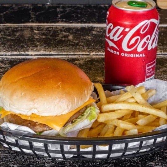 Um burguer com queijo cheddar, salada e deliciosa maionese . Acompanha batata e bebida a escolha