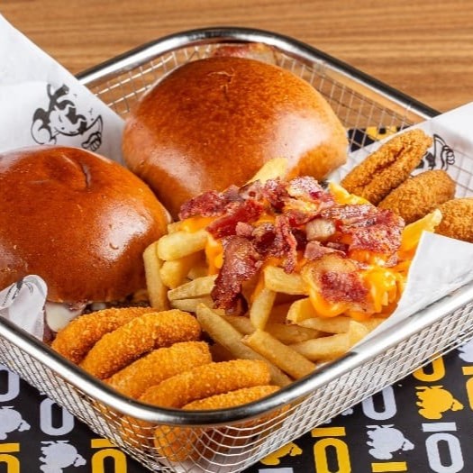 Experimente nosso irresistível Combo: dois suculentos Burgers (100g cada), Bacon crocante, Queijo Cheddar derretido, Pão brioche e Maionese temperada! Acompanha Nuggets crocantes, Anéis de Cebola e Batata Frita deliciosa com Cheddar e Bacon. Uma explosão de sabor!