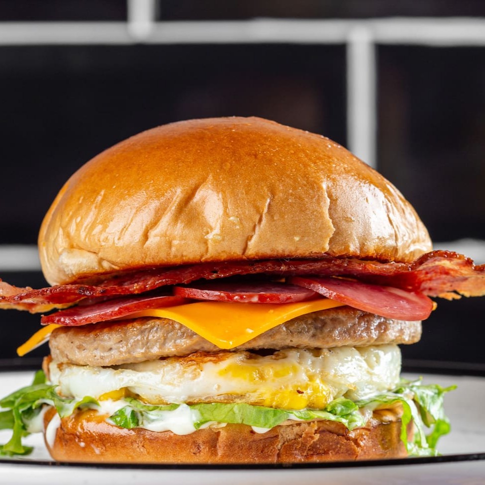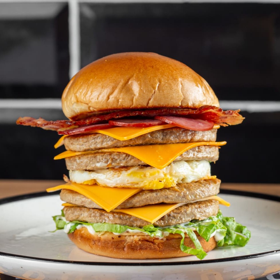 Um exagero de Hambúrguer feito com Pão macio de Brioche, generosa combinação de 4 suculentas carnes e 4 fatias de queijos, irresistível calabresa, maionese especial, ovo perfeitamente frito, delicioso bacon crocante e fresca salada. Satisfação garantida!