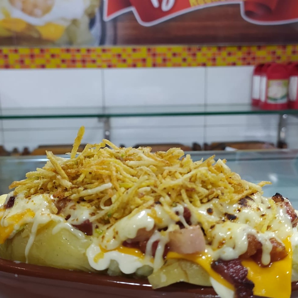Batata assada temperada com manteiga especial da casa, requeijão, queijo cheddar Polenguinho, mussarela e batata palha.