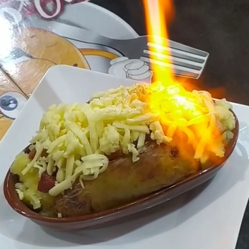 Deliciosa batata assada, temperada com manteiga da casa, molho branco, presunto, bolonhesa e mussarela.