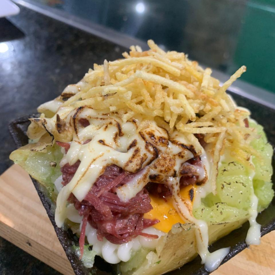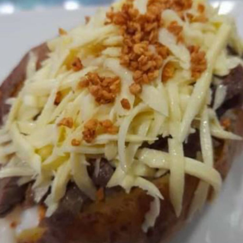 Deliciosa batata assada temperada com manteiga da casa, carne de sol na manteiga de garrafa, requeijão, queijo coalho e finalizada com alho torrado.
