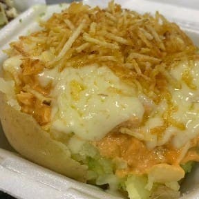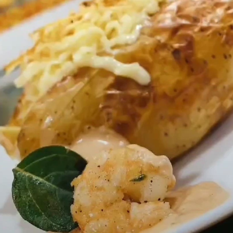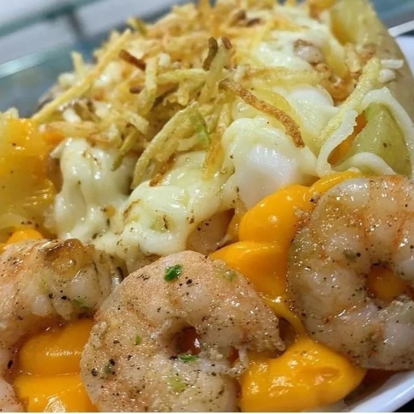 Deliciosa batata assada temperada com manteiga especial da casa, requeijão, cheddar, Camarões selecionados, mussarela e batata palha.