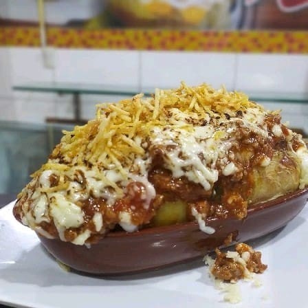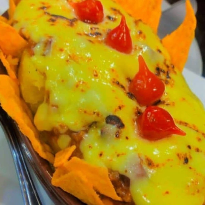 Batata assada temperada com manteiga temperada da casa, queijo cheddar, bolonhesa, calabresa, mussarela, pimenta biquinho, Doritos.