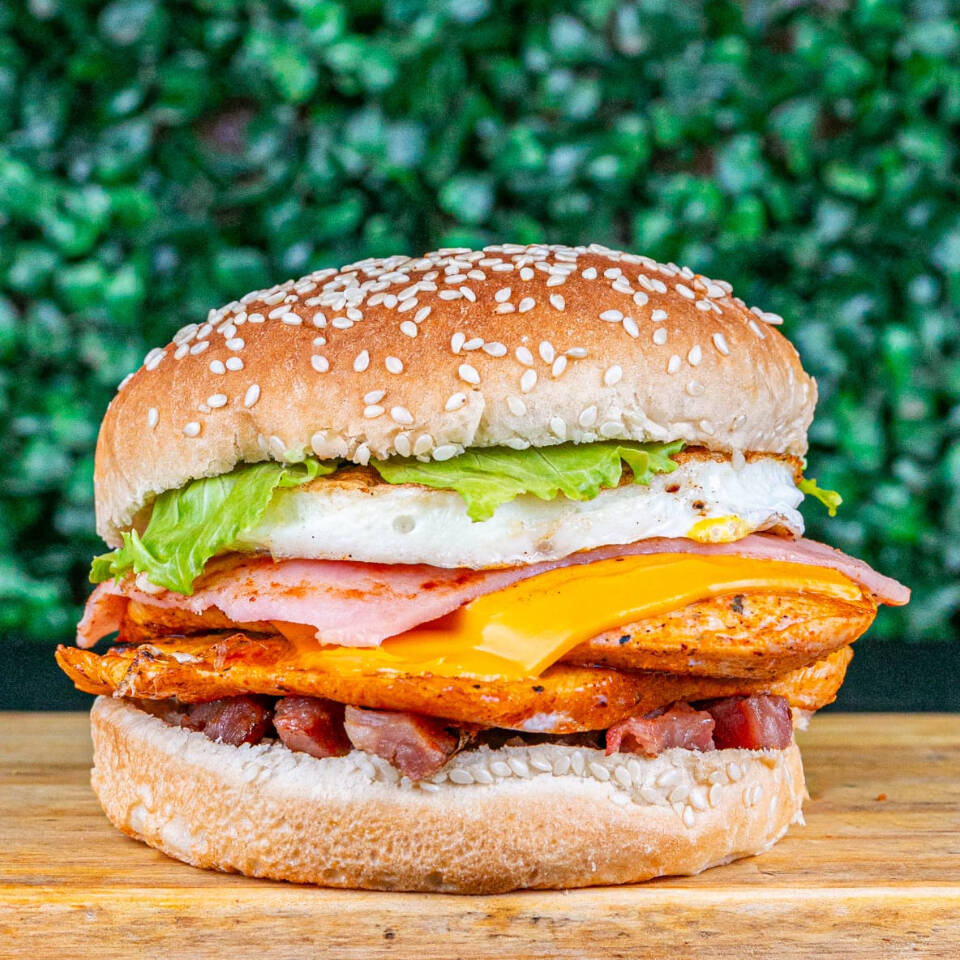 Pão gergelim , carne de picanha , queijo , presunto , bacon , ovo , cheddar cremoso , ketchup , maionese temperada e alface l