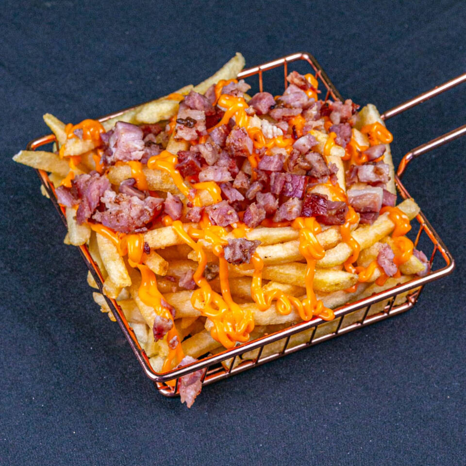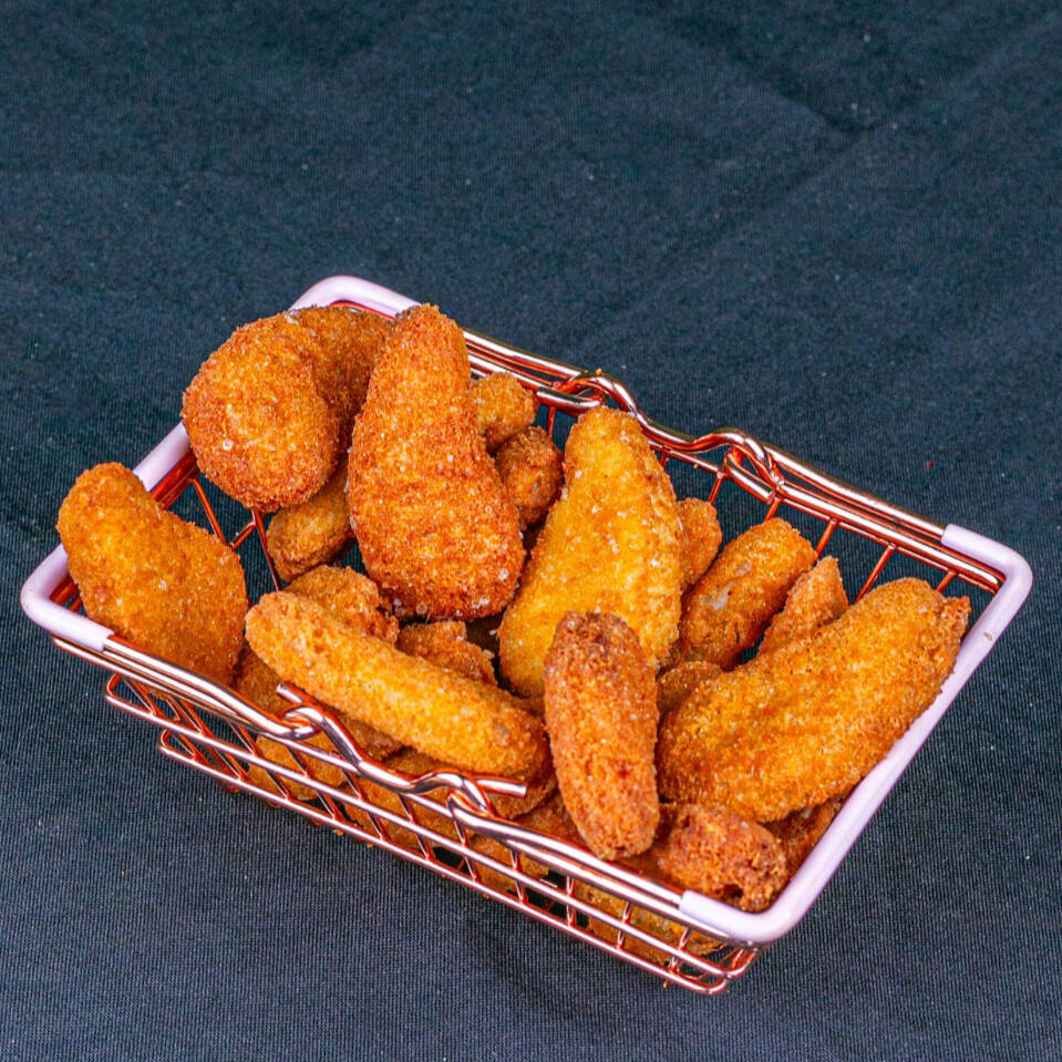2 x-montanha (pão gergelim , bacon , molho cheddar , catchup ,maionese temperada,2 ovos,queijo e salada) 15 salgadinhos , 6 unidades de nuggett ,porção de batata com calabresa .