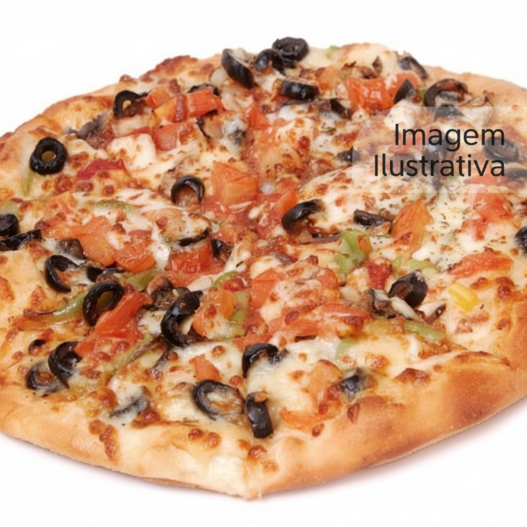 Massa fresca, molho de tomate, mussarela, presunto, tomate, cebola, pimentão, ovo e oregano