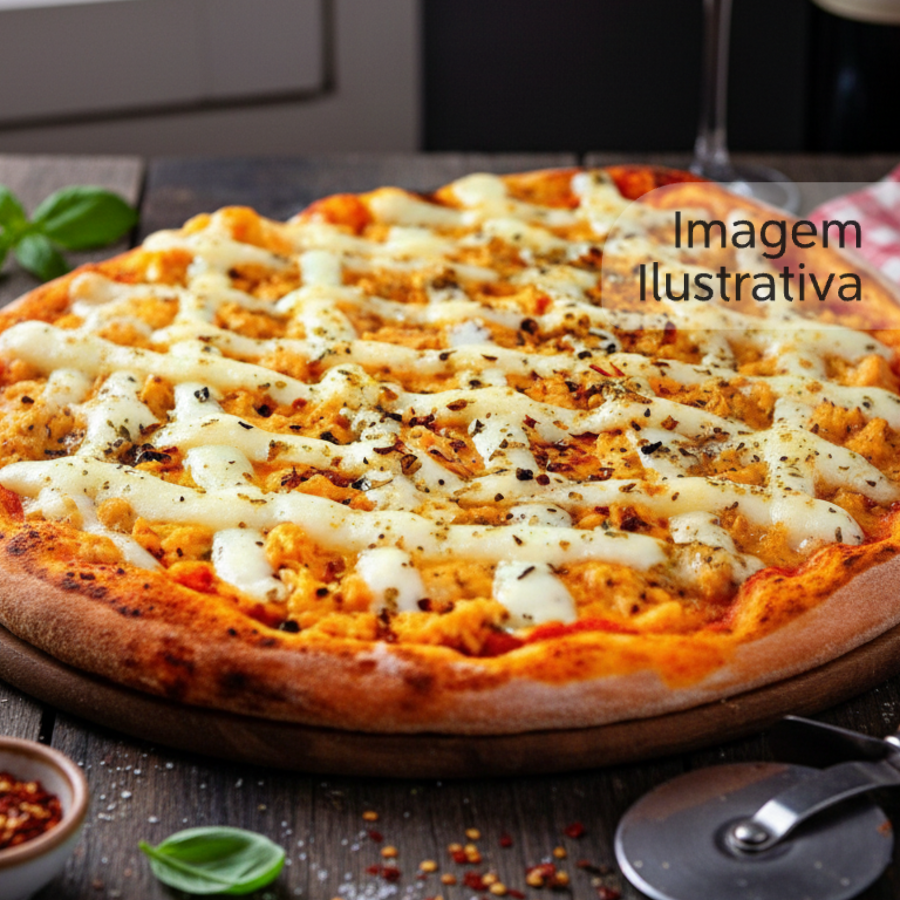 Massa fresca, molho de tomate, frango desfiado, catupiry e orégano
