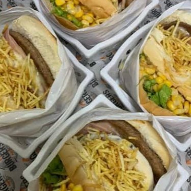 Pão, 2 carnes de hambúrguer, 2 ovos, presunto, queijo, bacon, calabresa, cheddar, milho, ervilha, alface, rodelas de tomate e batata palha