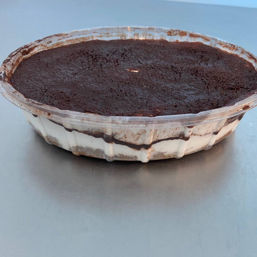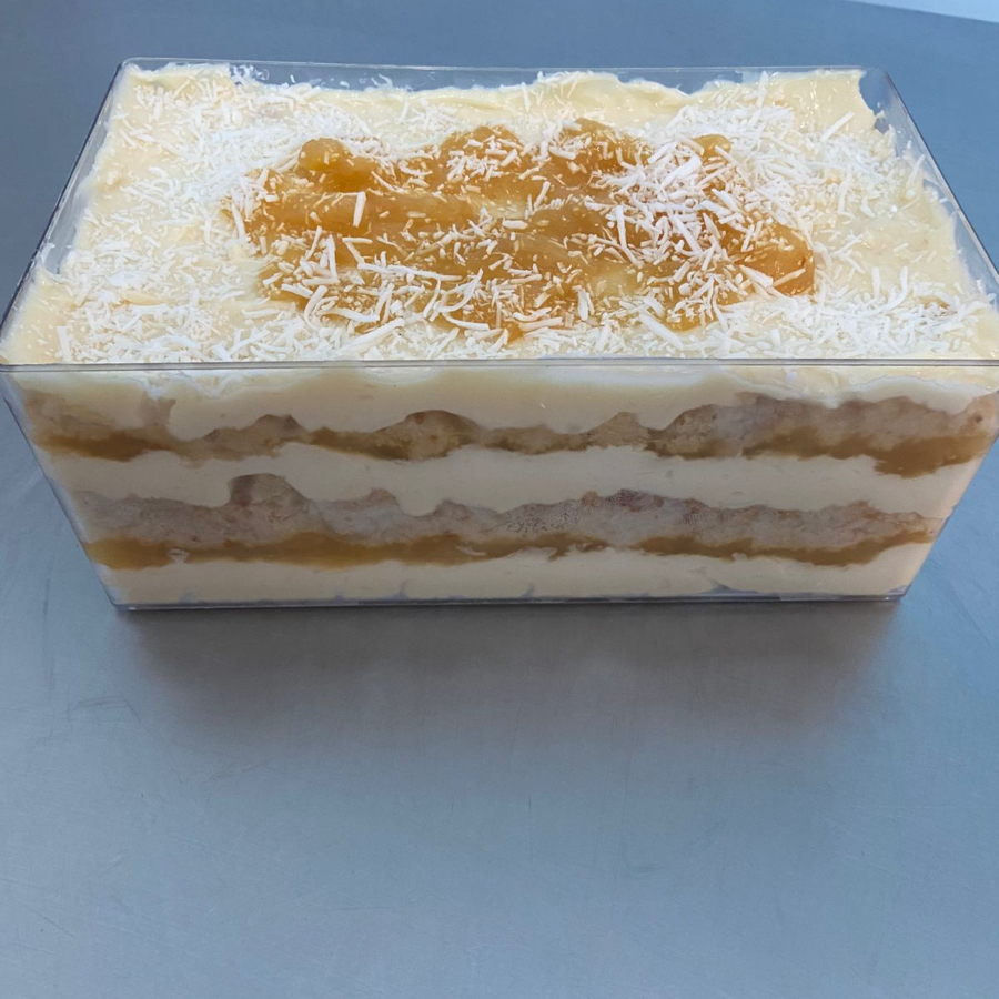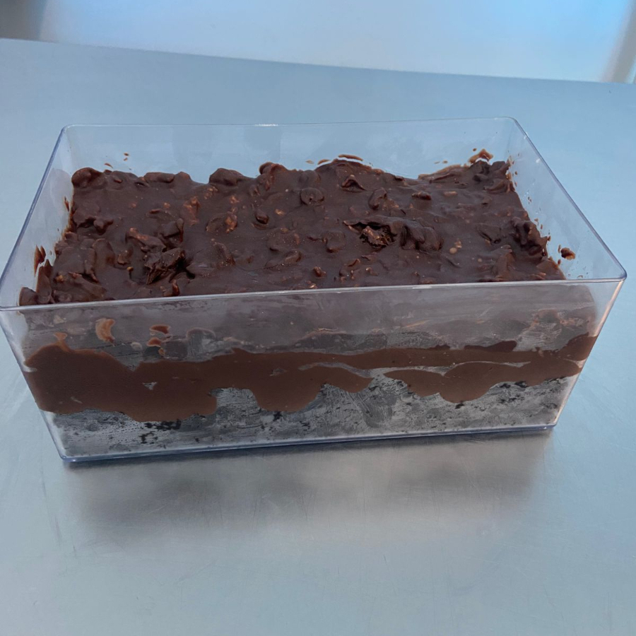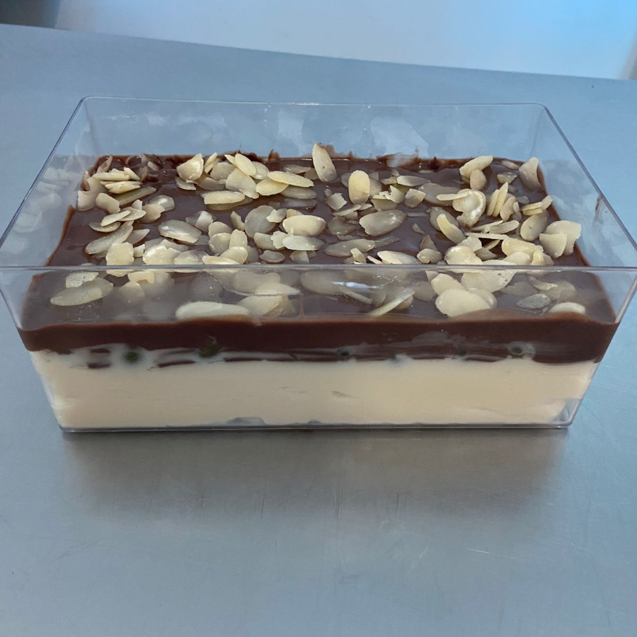 Camadas de creme de confeiteiro de baunilha e chocolate, intercalado com biscoito maisena e coberto com ganache de chocolate meio amargo.