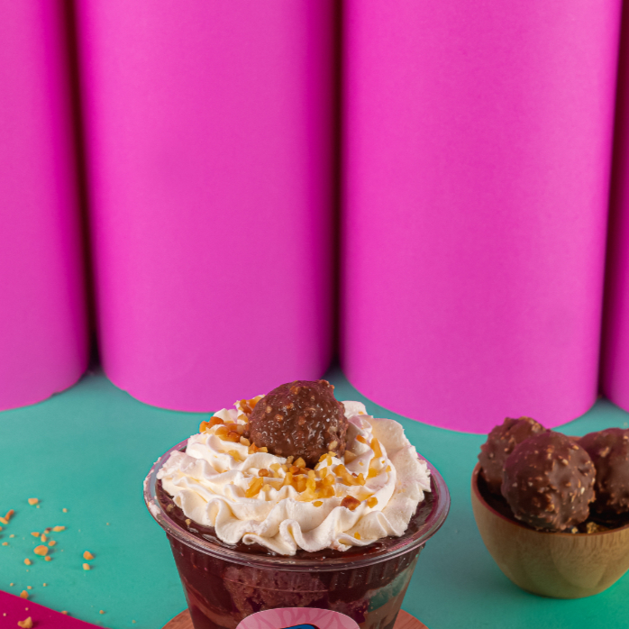 Camadas de brigadeiro cremoso, brownie, creme bueno, com pedaços de Kinder bueno, Nutella e chantily com um toque de cacau para finalizar.