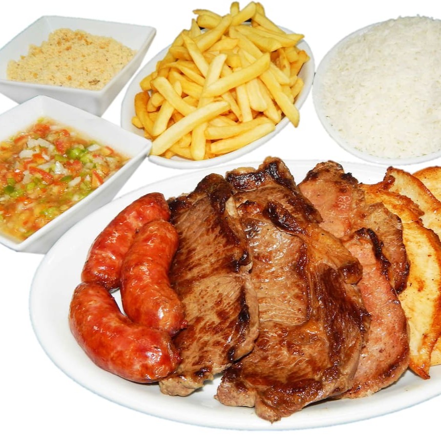 Filé de frango, contra filé, linguiça e bisteca suiná, grelhado na chapa, a companha arroz, frita, vinagrete, farofa de ovo e feijão