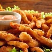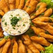 pequenos pedaço de peixe empanados e fritos no óleo vegetal com molho tátaro.