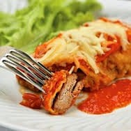 contra filé à milanesa com queijo e presunto com molho de tomate, arroz branco e purê de batatas