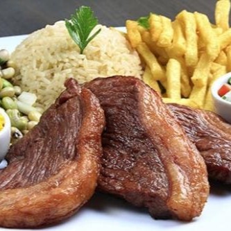 Contra-filé com arroz, batata frita, farofa e alho frito.