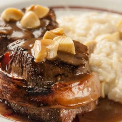 Medalhão de filé mignon com bacon ao molho madeira e arroz à piemontese