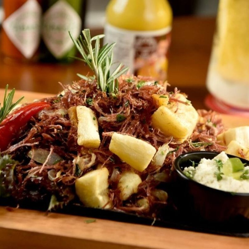 Acompanha arroz branco ou arroz Biro Biro, feijão, farofa de ovo, batata frita e molho vinagrete Contra File
