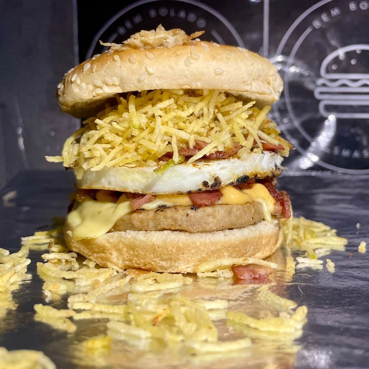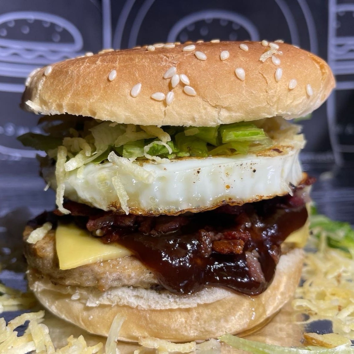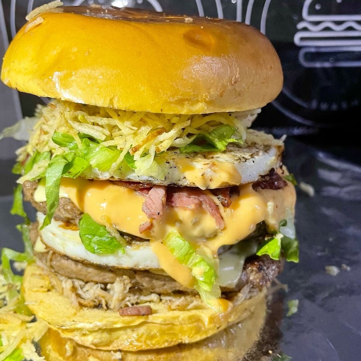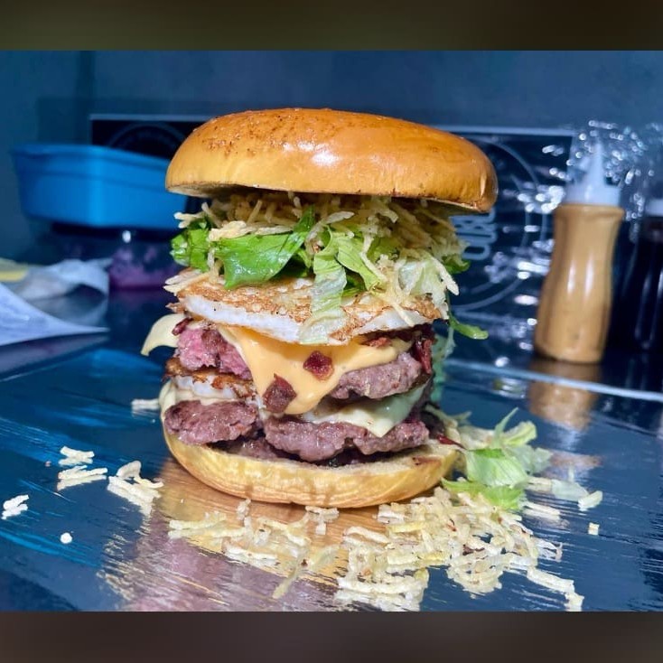 Pão brioche, 2 carnes artesanal, 2 queijos prato, 2 ovos, bacon fatiado, batata palha, escolha seu delicioso molho.