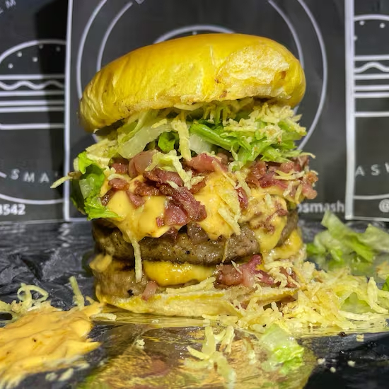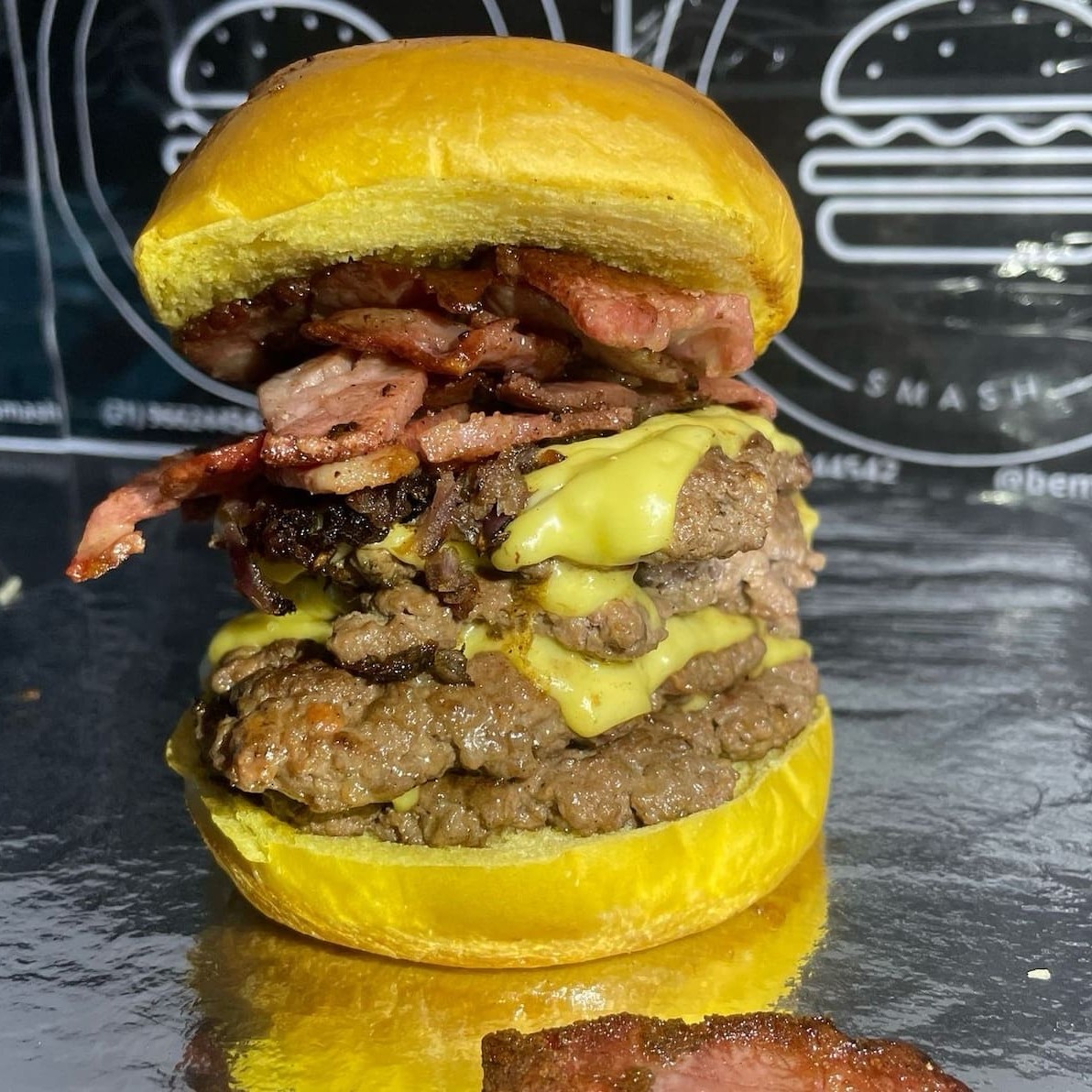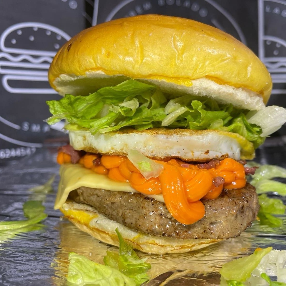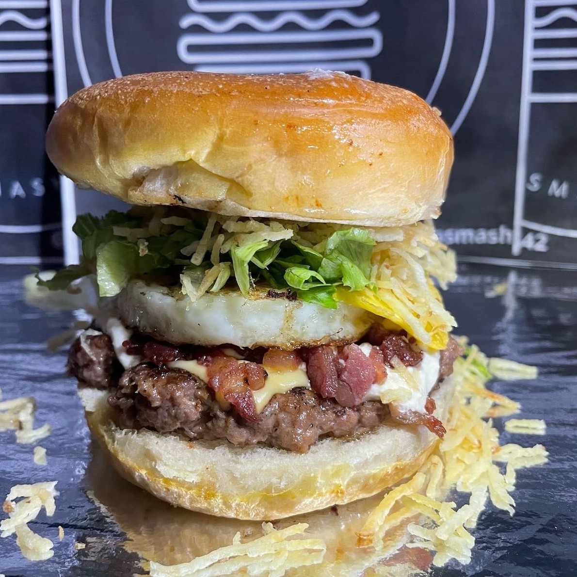 Pão brioche, 2 carnes artesanal, 2 queijos prato, 2 ovos, bacon fatiado, batata palha, escolha seu delicioso molho.