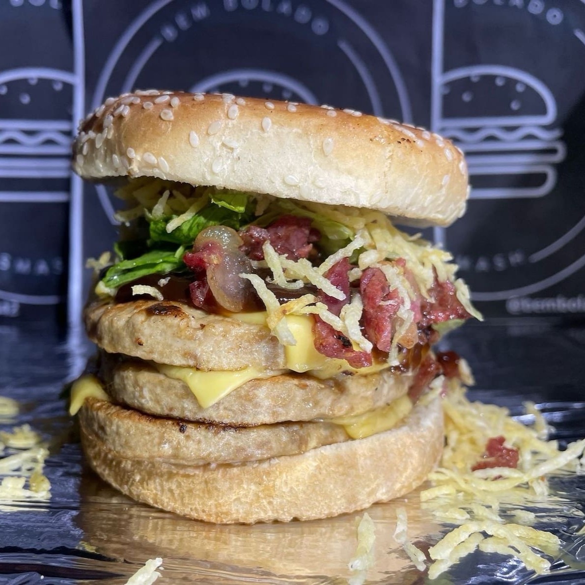 Pão brioche, 3 carnes de picanha 120g, 3 queijos prato, bacon fatiado, batata palha, escolha seu delicioso molho.