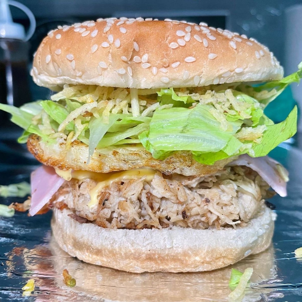 Pão com Gergelim, 2 Frango Empanado, Maionese da Casa, Bacon Fatiado, Alface Americana