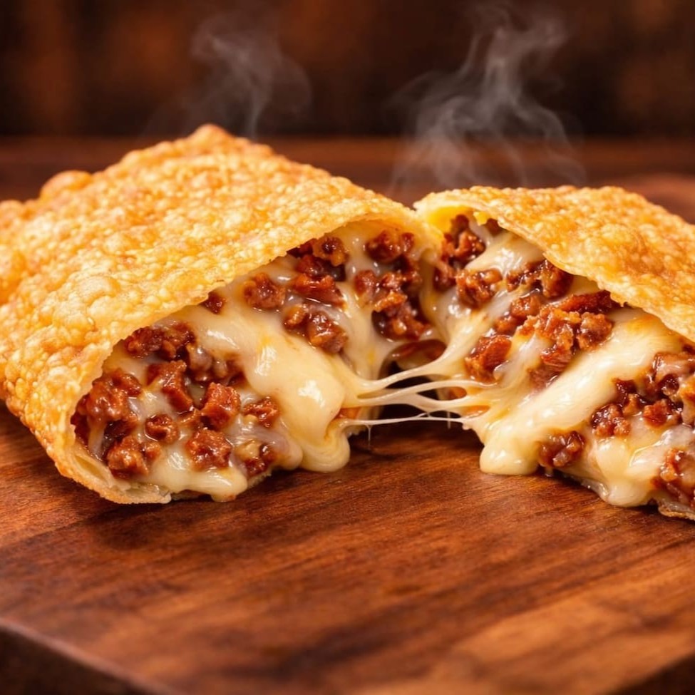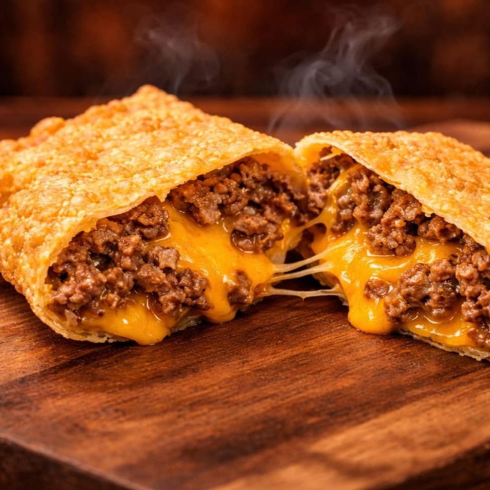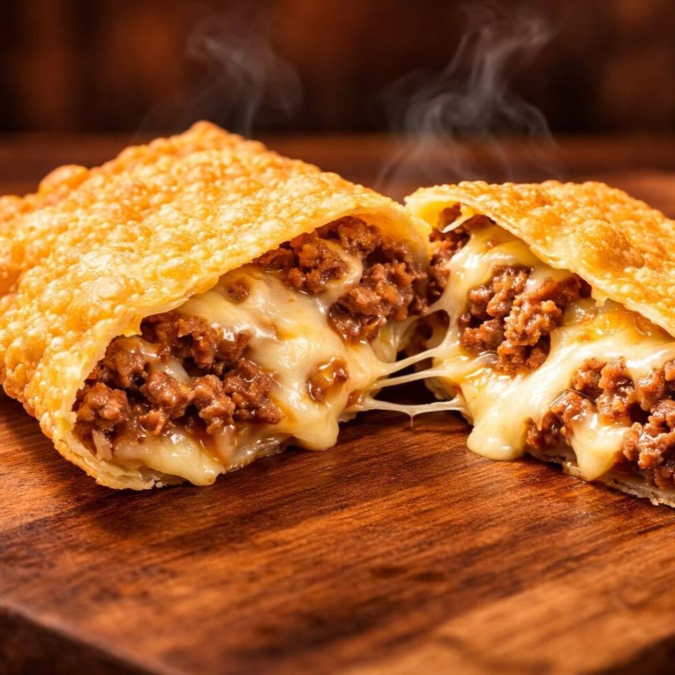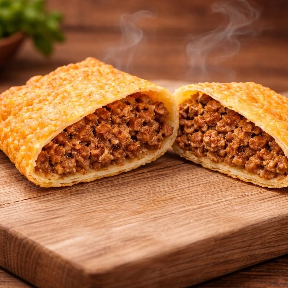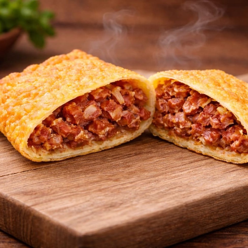 Pastel grande de 20cm, com carne bem temperada e cheddar cremoso, em massa crocante e sequinha. Acompanha complementos grátis. Feito na hora!