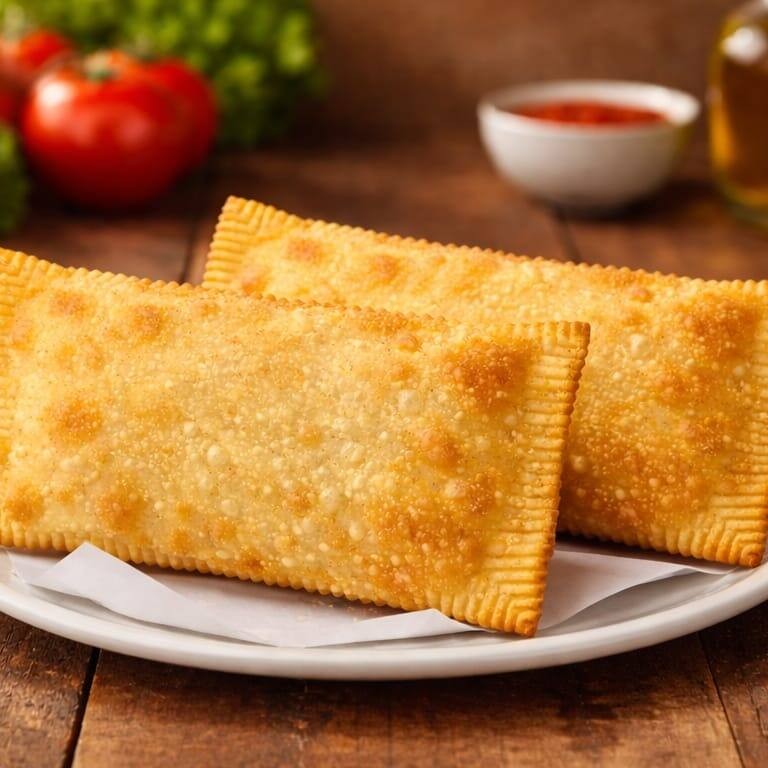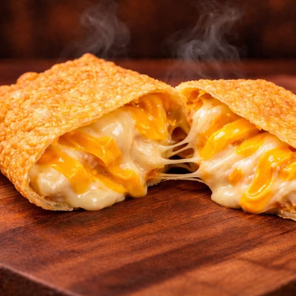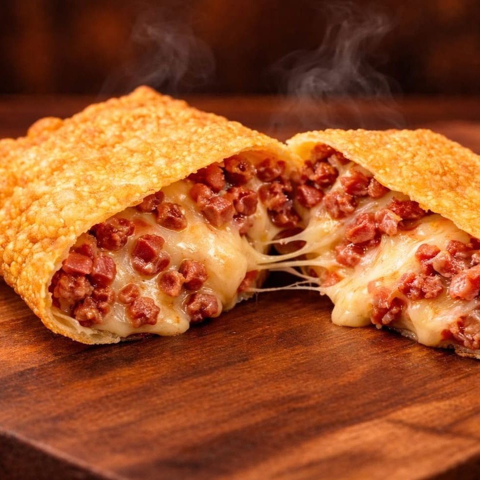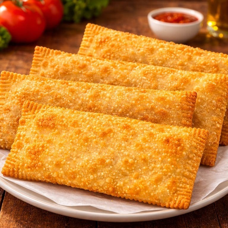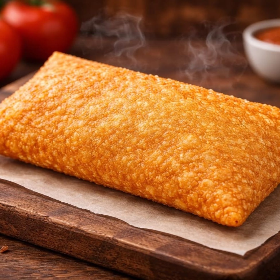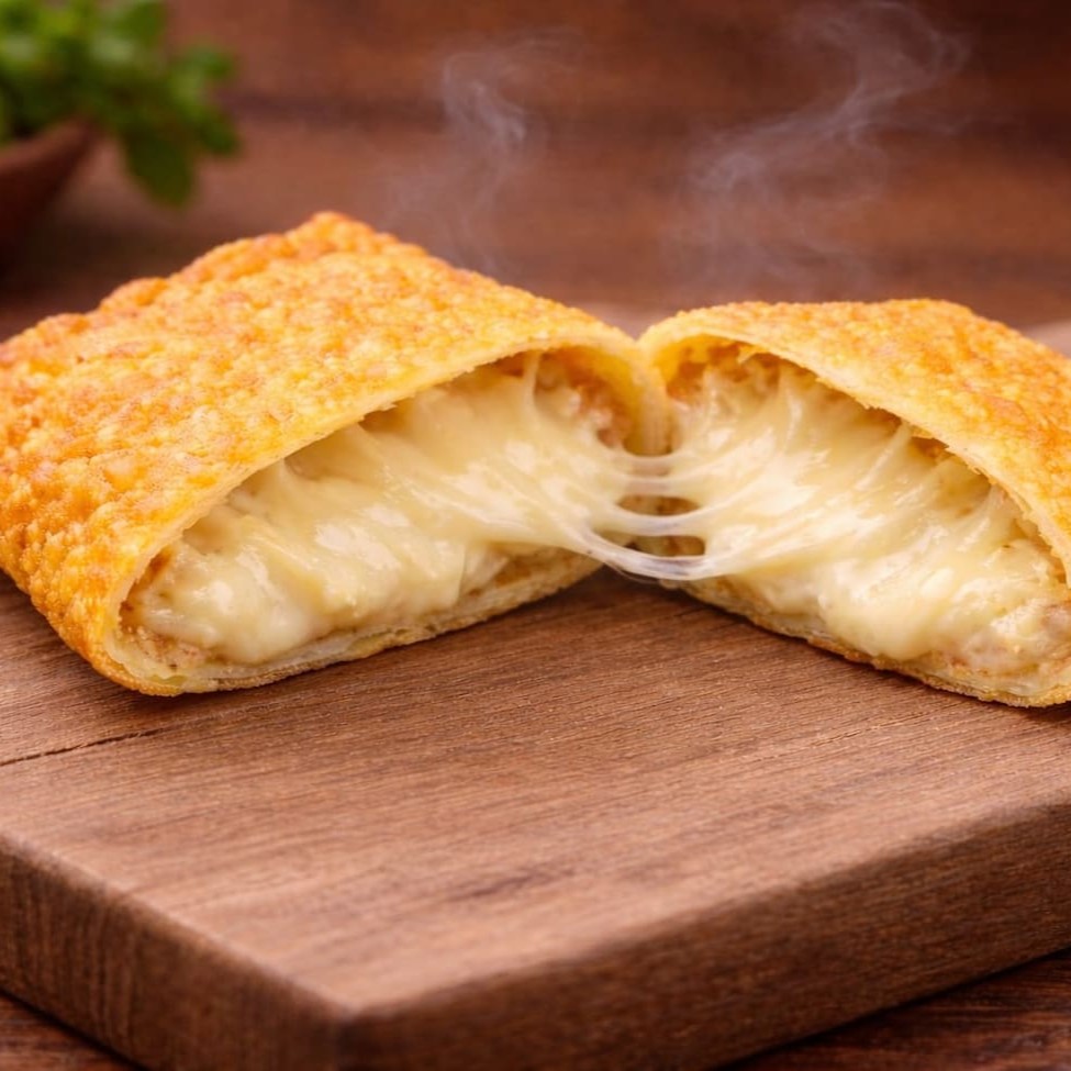 Pastel grande de 20cm, com mussarela derretida, Catupiry e cheddar cremoso, em massa sequinha e crocante. Acompanha complementos grátis. Feito na hora!