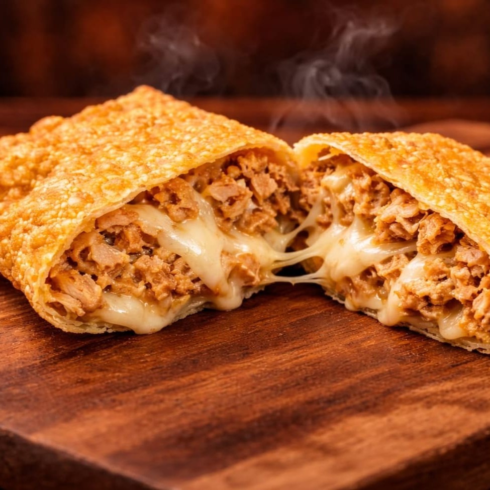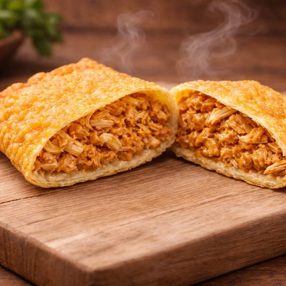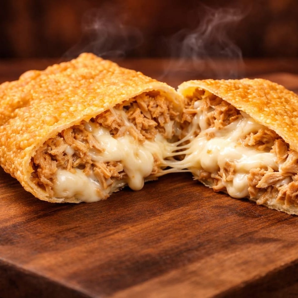 Pastel grande de 20cm, com frango desfiado bem temperado e Catupiry cremoso, em massa crocante e sequinha. Acompanha complementos grátis. Feito na hora!