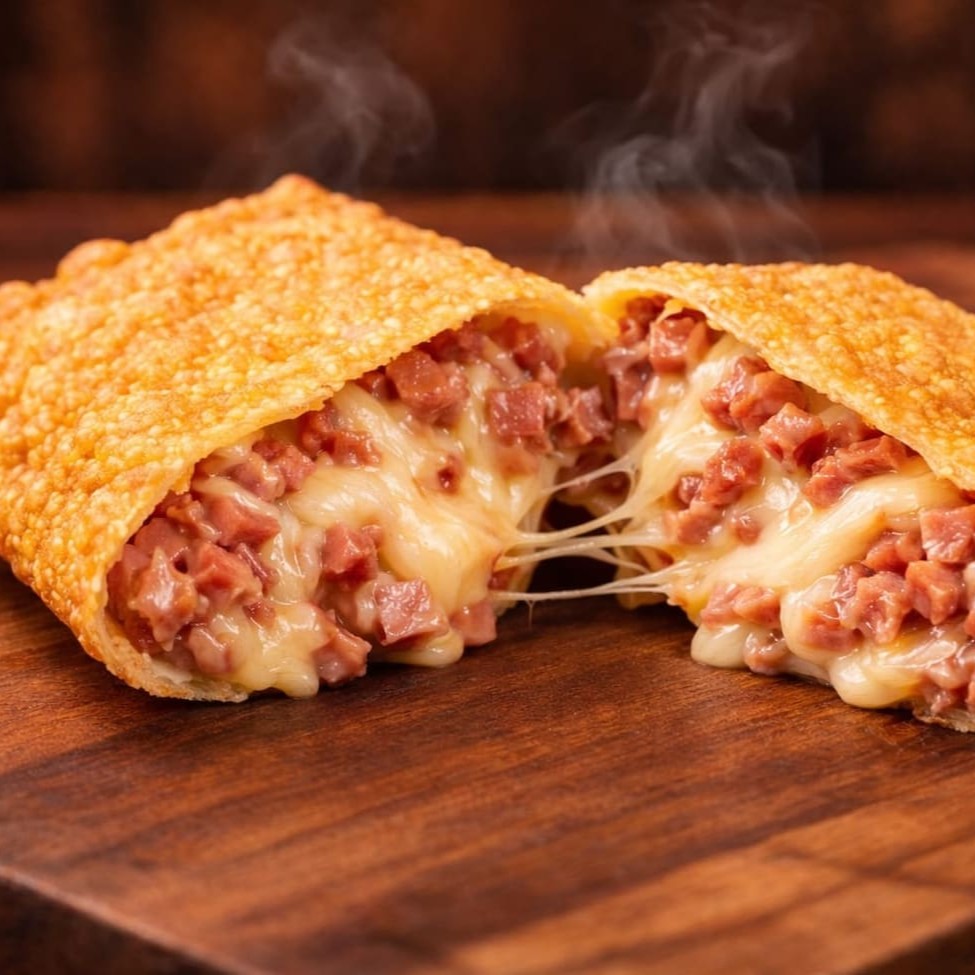 Pastel grande de 20cm, com mussarela derretida e presunto saboroso, em massa sequinha e crocante. Acompanha complementos grátis. Feito na hora!