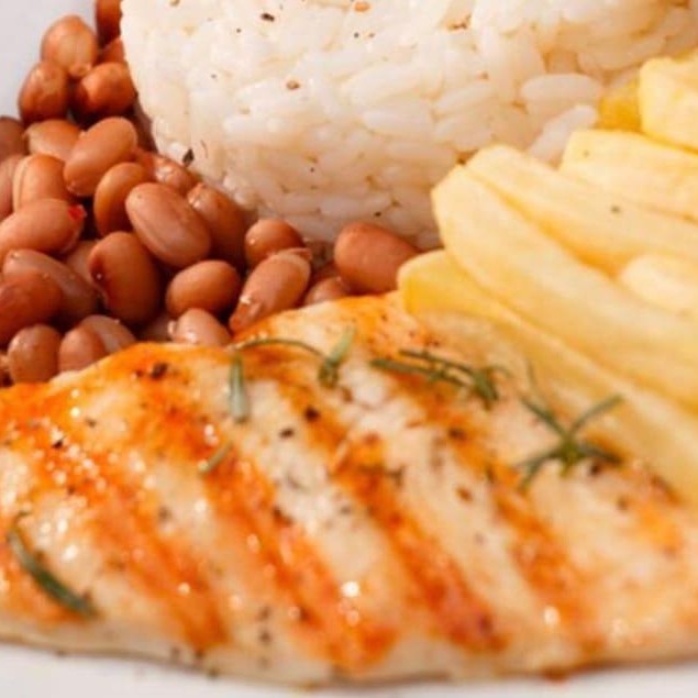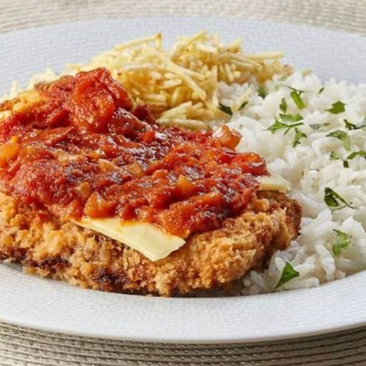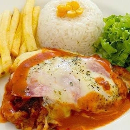 Delicioso file de frango a parmegiana, podendo ser acompanhado por Arroz, Feijão, Batata Frita, Salada, Farofa ou Batata Palha