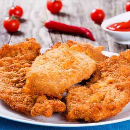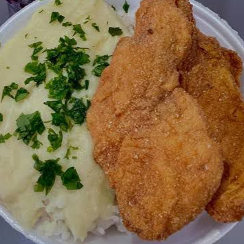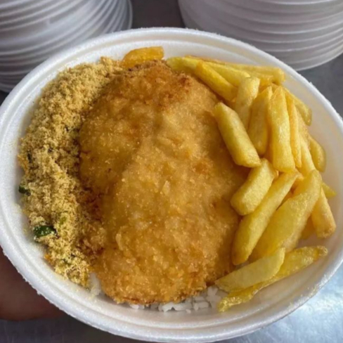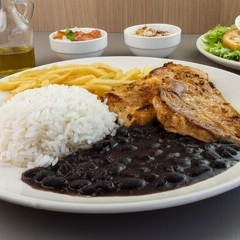 Arroz, Feijão, Frango a Milanesa, Batata Frita e Farofa