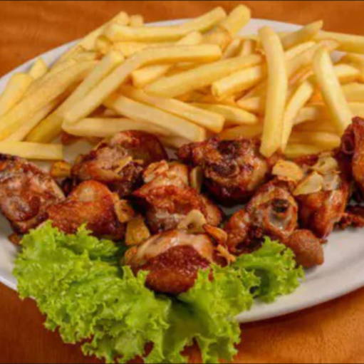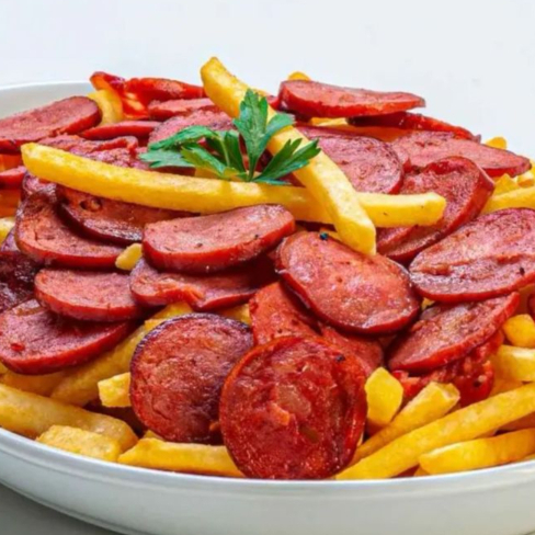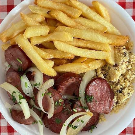 Arroz, Feijão, Calabresa Acebolada, Batata Frita e Farofa