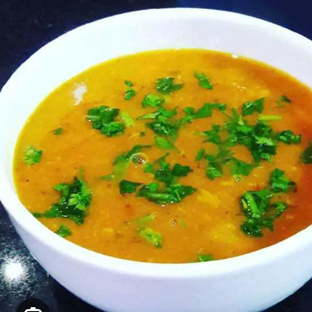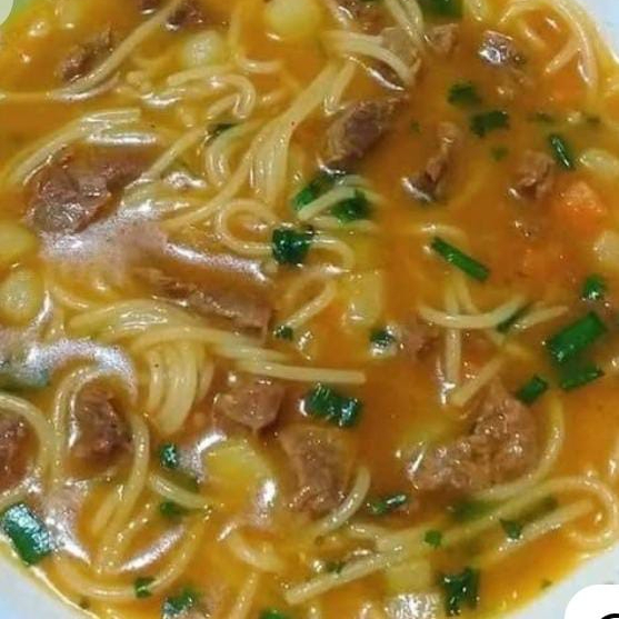 Sopa robusta com pedaços de carne macia e legumes variados, ideal para uma refeição completa.