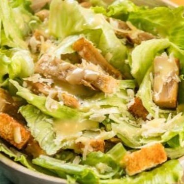 Alface, queijo ralado, croutons, isca de filé de frango e molho parmesão.