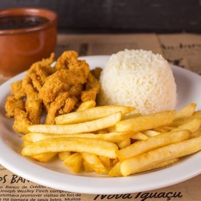 Acompanha arros branco, fritas e salada (alface e tomate).