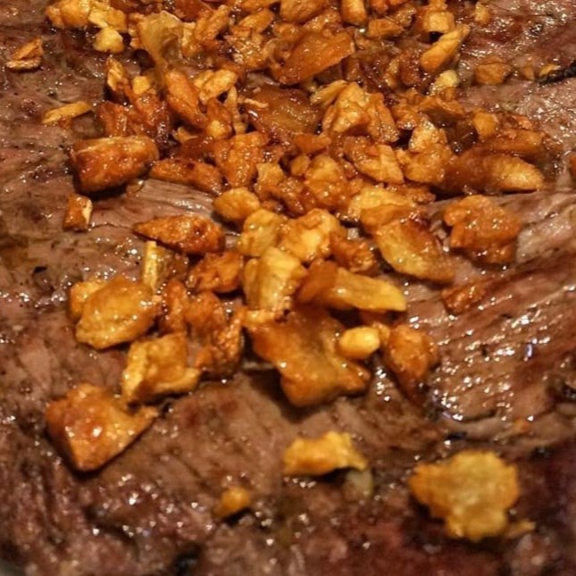 Bife de filé mignon, alho, arroz branco e batata frita.
