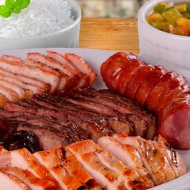 Alcatra, Frango e Linguiça de Pernil. Farofa e Molho a campanha.