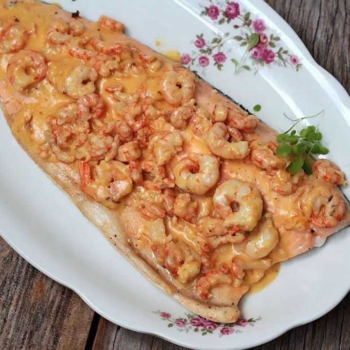 File De Peixe Grelhado Com Molho De Camarão Combinado, Arroz De Brócolis E Purê.