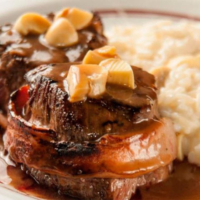 Medalhão de mignon bovino enrolado com bacon combinado com molho madeira. Acompanhamento: Fritas e Arroz À piamontese.