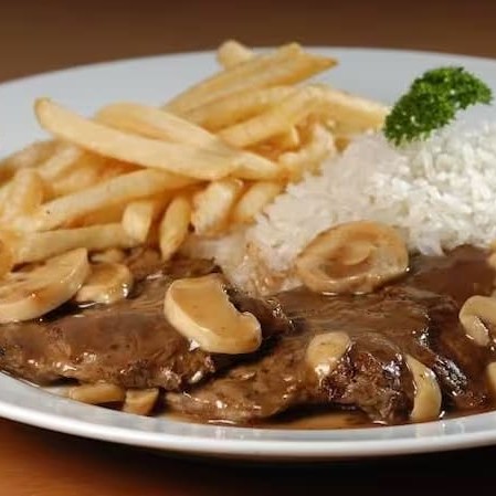 Bifes de filé mignon ao molho madeira e champion, arroz à piámontese e batata frita.