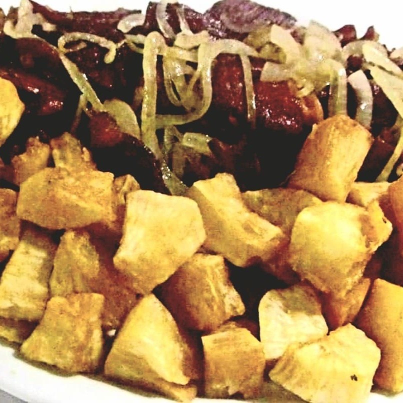 Filé mignon acebolado, queijo coalho,aipim frito e pão francês.