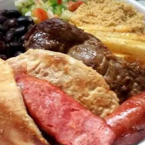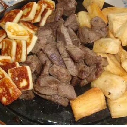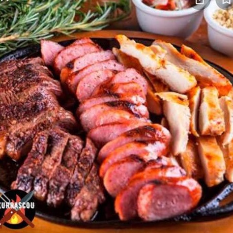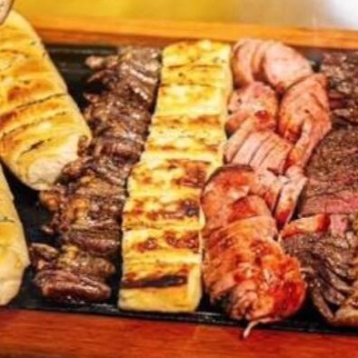 Churrasco misto : 2 contra filé, 2 linguiça de pernil, 2 queijo coalho, 15 um de coração de frango,2 pão de alho, aipim frito, molho vinagrete e e farofa brasileira