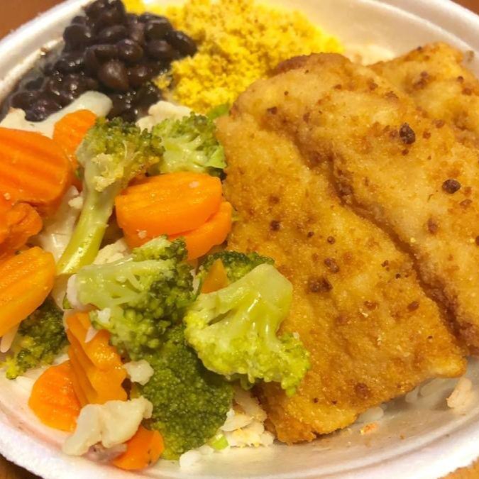 Filé De Frango À Milanesaacom :arroz,feijão, Farofa E Legumes Cozidos (quentinha)