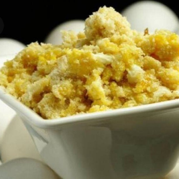 Acom: arroz verdinho, farofa de ovos,batata canoa e molho a campanha