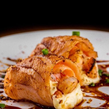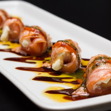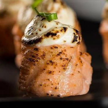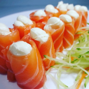 laminas de salmao flambadas, cream cheese e cebolinha