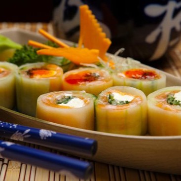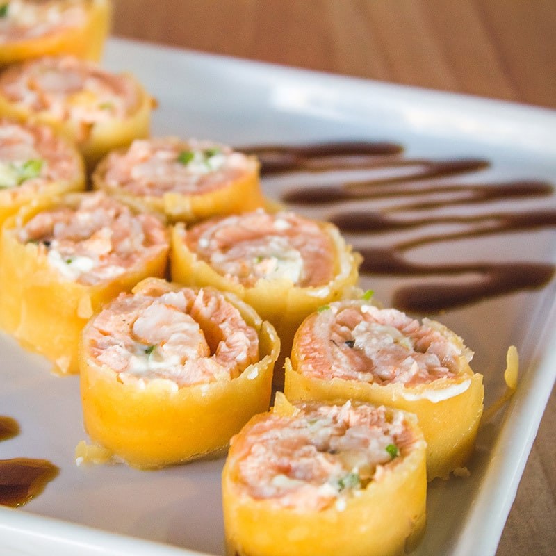 Rolinho primavera recheado com salmão, cream cheese e cebolinha